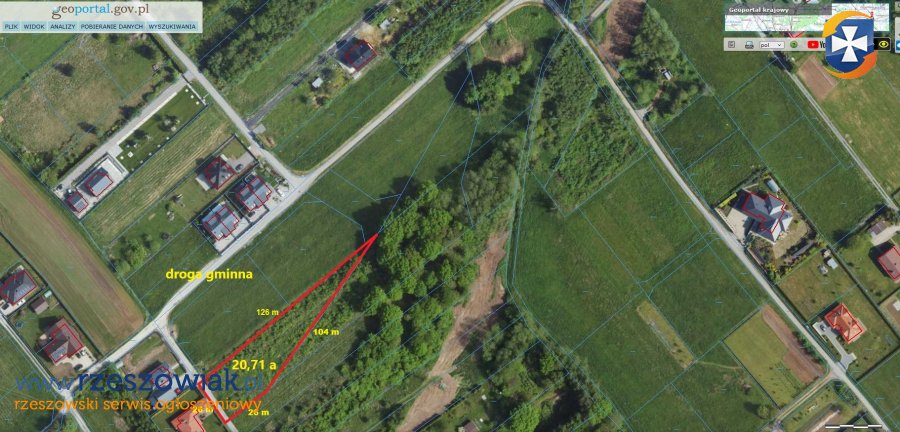 - działka 20,71 a, wymiary, kształt trapezu: 26 m wjazd, od południa 26 m + 104 m, od północy 126 m