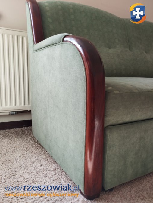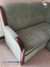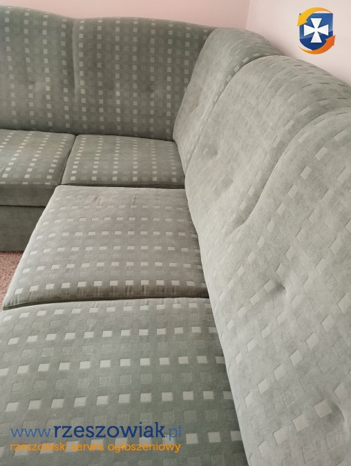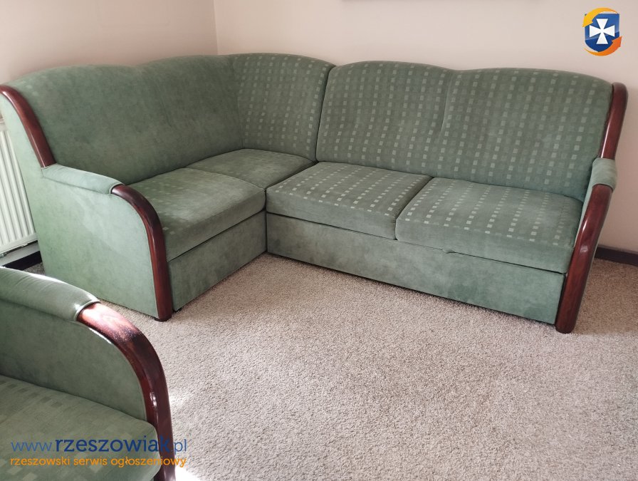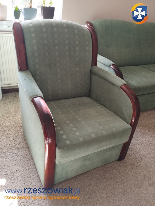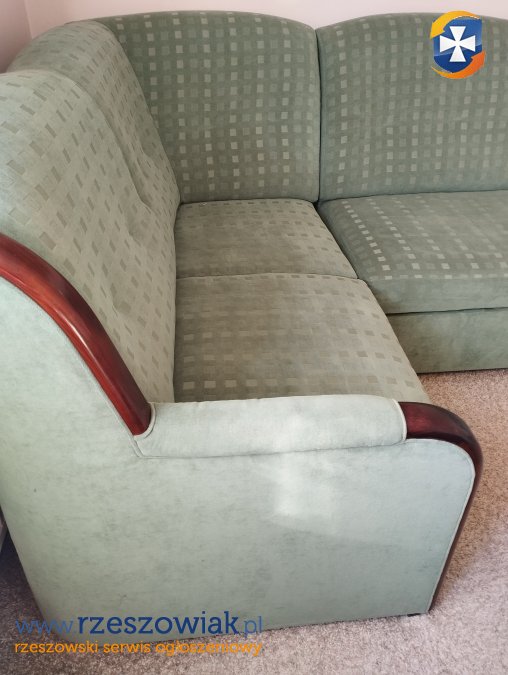 Sprzedam jasnozielony narożnik z wykończeniami drewna i fotel - komplet w bardzo dobrym stanie. Pufa do kompletu. Zapraszam do oglądania w Łańcucie.