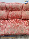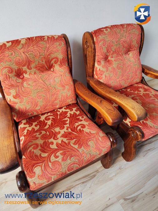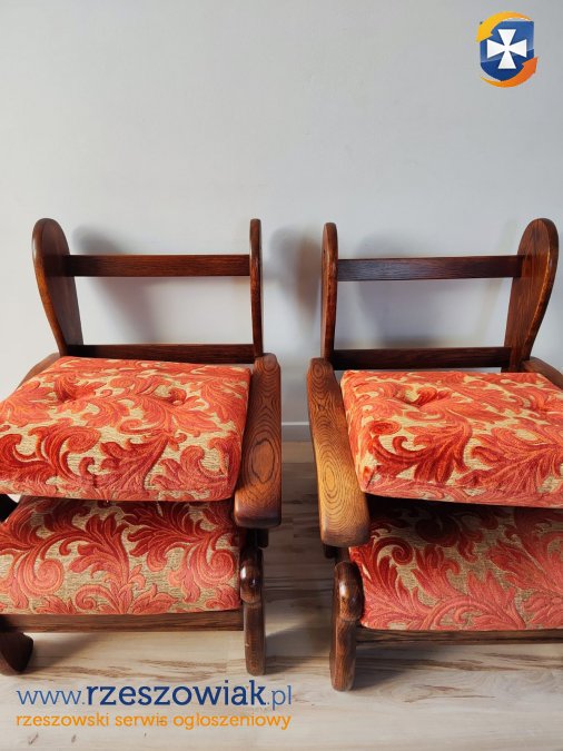 Drewniana konstrukcja, obicie beżowo czerwone. Na jednym siedzisku uszkodzony materiał.