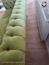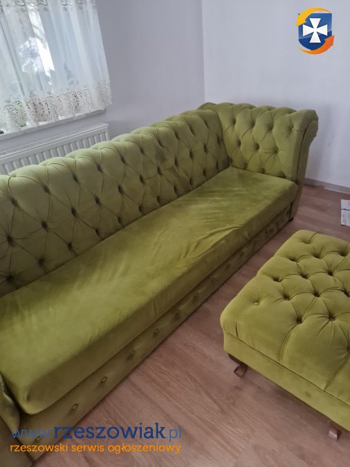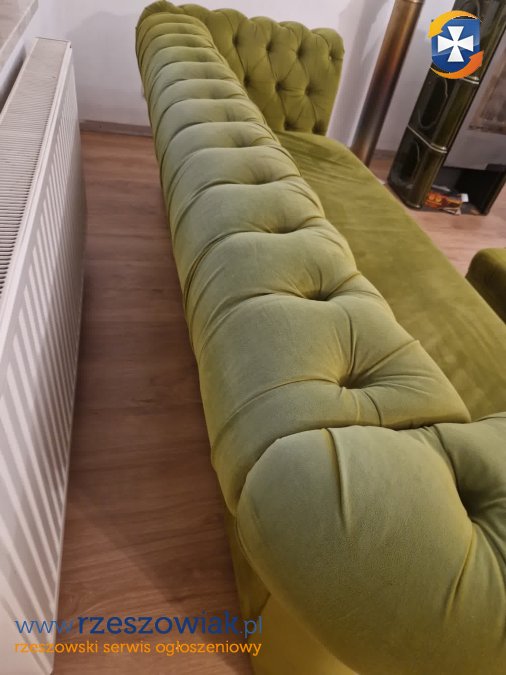 Sprzedam komplet sofa chesterfield plus pufka, robione na zamówienie w Bogart Meble. Nie ma funkcji spania. Cena 350 zł do delikatnej negocjacji. Wymiary sofy: długość 252 cm, szerokość 90 cm, wysokość 76 cm. Siedzisko: długość 190 cm, głębokość 56 cm. Pufa: 74x53x42 cm. Sofa do odczyszczenia i jeszcze posłuży. Pokrycie odporne na pazurki kota, odbarwienia z tyłu od światła słonecznego. Siedzisko z gombki bez sprężyn, zapinane na zamek. Transport we własnym zakresie.