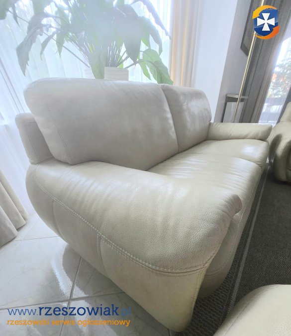 Sprzedam komplet wypoczynkowy w klasycznym stylu â wygodna sofa dwuosobowa i dwa szerokie fotele wykonane z naturalnej skóry w kolorze kremowym.
