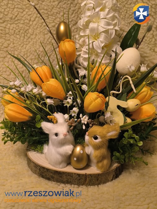 Sprzedam kompozycję wielkanocną, świąteczną na plastrze drewna, mech,kwiaty,dodatki sztuczne,zajączki futrzane.Wszystko mocowane na kleju na gorąco.