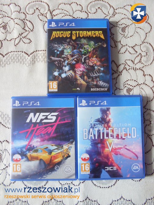 Sprzedam konsole PlayStation 4 slim CUH-2116A - pad, przewody: do ładowania pada i zasilający. Gry: - Rogue Stormers PL - Battlefield V PL - Need For Speed Heat PL