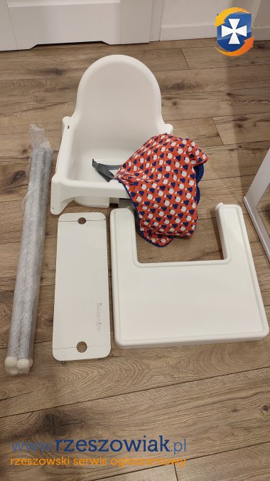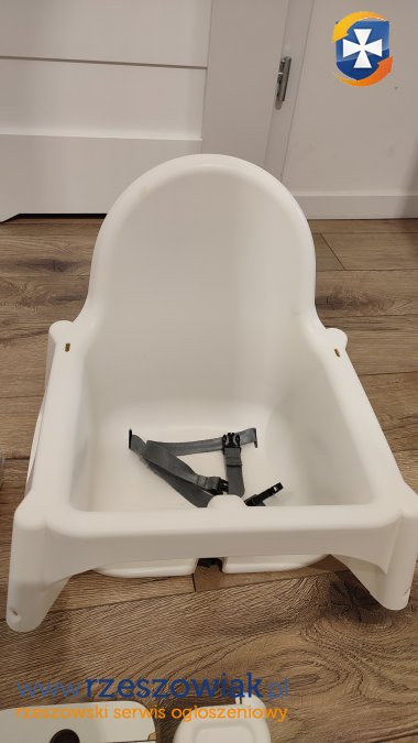 Dodatkowo w komplecie: drewniany przykręcany podnóżek (dokupiony na alaantkoweblw) oraz dmuchana poduszka z pokryciem (kupiona w IKEA, córka była raczej drobna więc poduszka przydała się na początku rozszerzania diety). Cena za wszystko to 60zł. Odbiór osobisty w Rzeszowie.