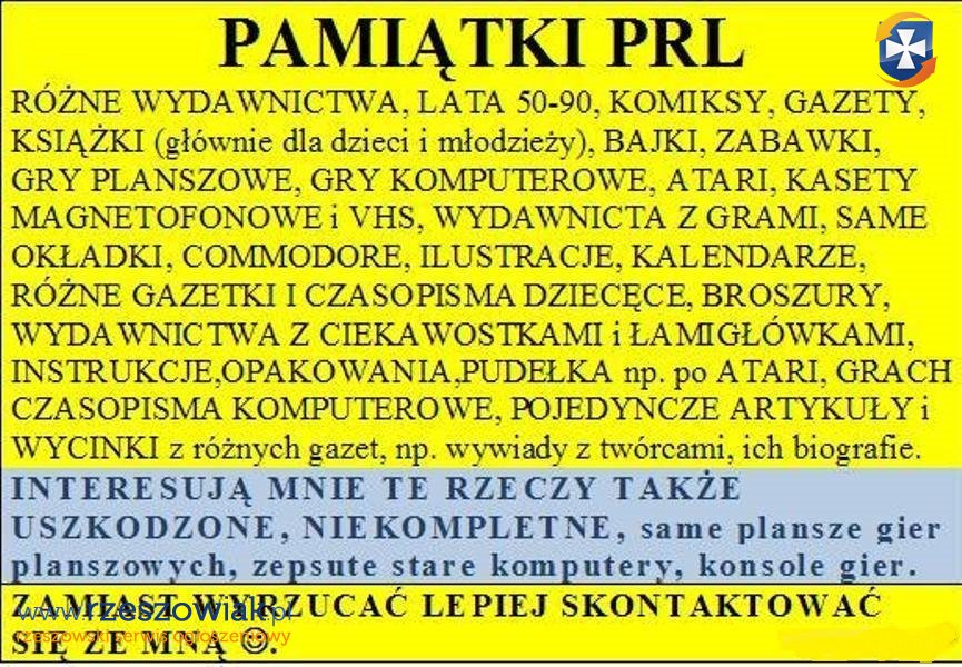 Sprzedam, kupię, powymieniam się, chętnie przyjmę antyki z PRL, czli wydawnictwa z lat 50-70, lata 80, 90 â często nazywa się to pamiątki z PRL.Interesują mnie komiksy, wydawnictwa komiksowe, gry planszowe, plansze do gier planszowych, czasopisma â zwłaszcza z ilustracjami, gazety i tygodniki dla dzieci i dorosłych, z grami, zagadkami, bajki, książeczki, wszelakie poradniki, kalendarze, kasety, winyle, nawet uszkodzone, no po prostu wszystko :-)