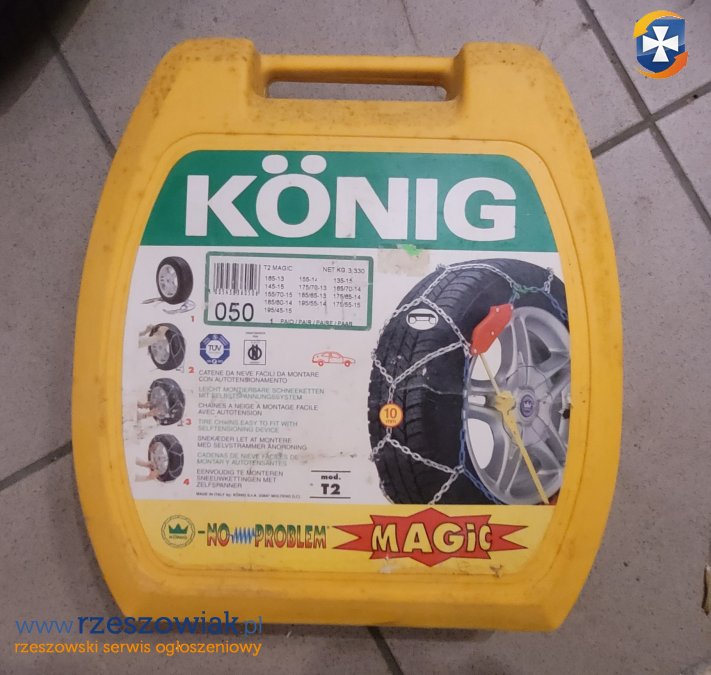 Sprzedam łańcuchy śniegowe Konig T2 Magic (50). Przeznaczone na koła jak w tabelce na załączonym zdjęciu. W zestawie 2 sztuki łańcuchów. Stan igła. Odbiór osobisty w Rzeszowie. Cena 250 zł.