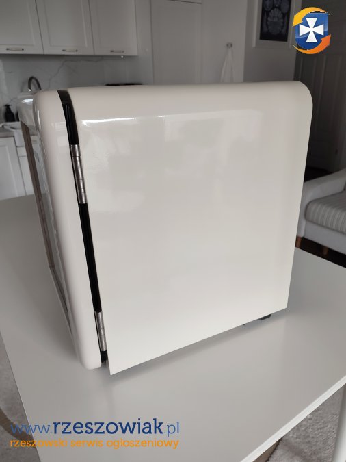 Lodówka jest w kolorze kremowym / jasnobeżowym. Dzięki stylowi vintage, opływowym kształtom i drewnianym półkom prezentuje się bardzo ładnie i ciepło.