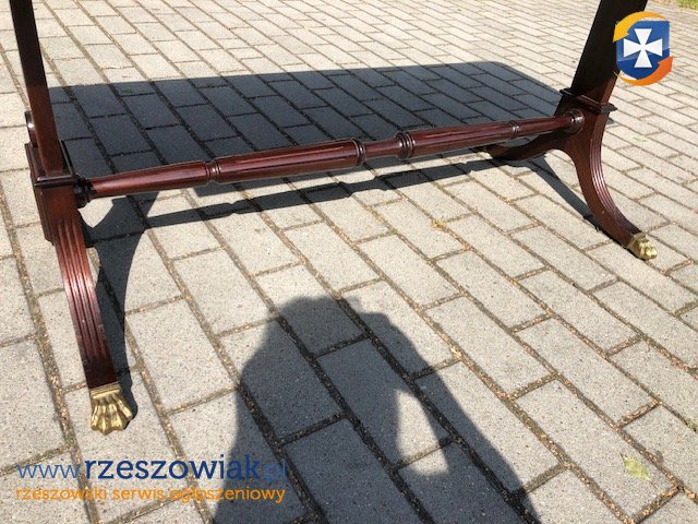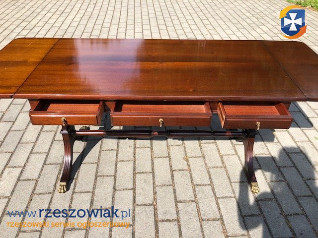Cechy charakterystyczne: - trzy funkcjonalne szuflady z ozdobnymi uchwytami, -solidne, rzeźbione nogi, zakończone mosiężnymi okuciami w formie lwich łap, - solidna, stabilna konstrukcja z eleganckim łącznikiem poprzecznym, - ponadczasowy design w stylu angielskim / regency