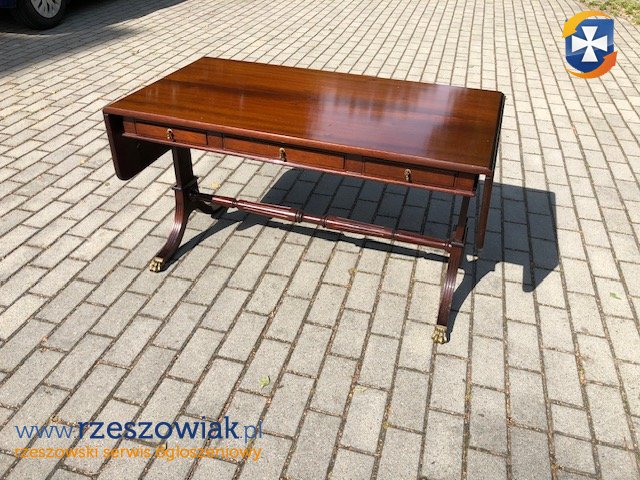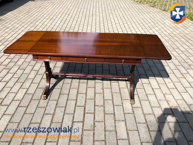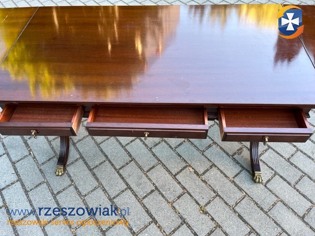 Cechy charakterystyczne: - trzy funkcjonalne szuflady z ozdobnymi uchwytami, -solidne, rzeźbione nogi, zakończone mosiężnymi okuciami w formie lwich łap, - solidna, stabilna konstrukcja z eleganckim łącznikiem poprzecznym, - ponadczasowy design w stylu angielskim / regency