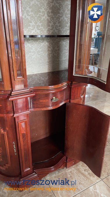 Sprzedam niezwykle efektowną witrynę w stylu klasycznym, o bogatej formie i wysokiej jakości wykonania. Mebel zachwyca detalami: giętymi szybami, dekoracyjnymi rzeźbieniami oraz eleganckim wykończeniem wnętrza. Idealnie sprawdzi się w jadalni jako ekspozycja szkła, porcelany i ozdobnych dodatków.