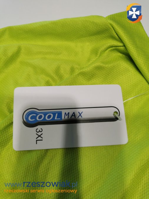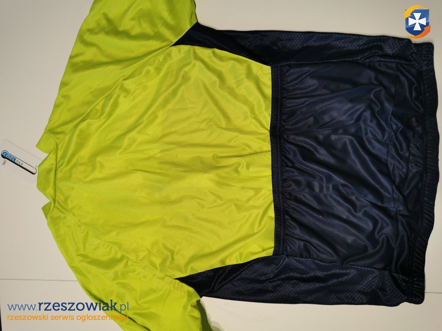 Sprzedam nową koszulkę rowerową z długi rękawem w rozmiarze 3XL. Koszulka w kolorze limonkowo-granatowym, zapinana na zamek błyskawiczny, w tylnej części kieszeń. Koszulka na osobę o wzroście około 185 cm.