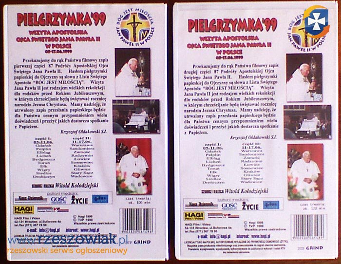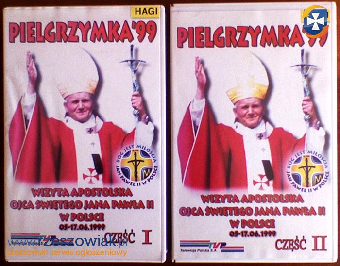 sprzedam oryginalne kasety vhs w bardzo dobrym stanie, "Pielgrzymka`99 - wizyta apostolska Ojca Świętego Jana Pawła II w Polsce 05-17.06.1999" cz. 1 i 2 dodatkowo 2 nowe, wszystkie 15zł.