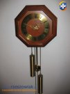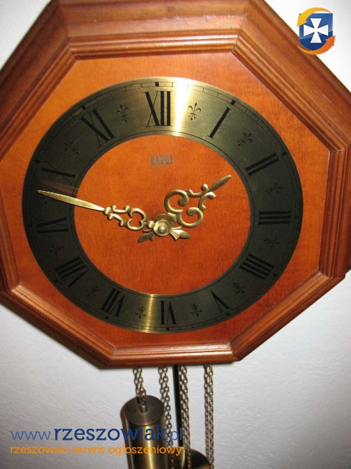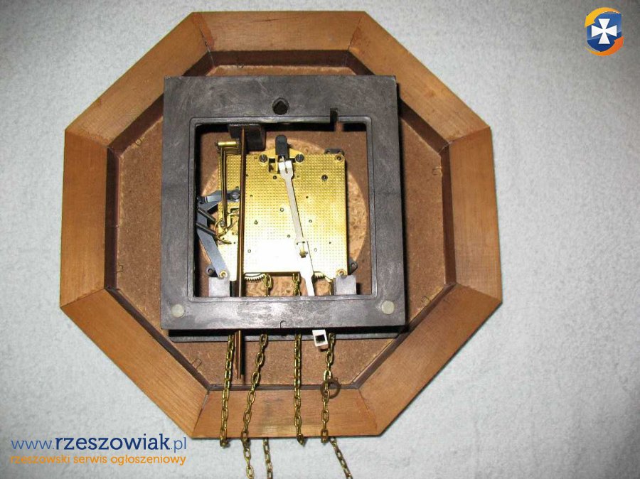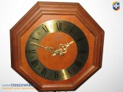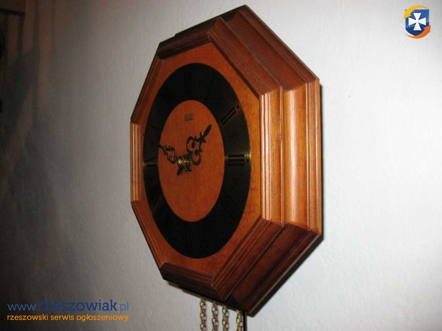 SPRZEDAM piękny drewniany zegar wiszący marki Baduf, z naciągiem łańcuchowym, produkcji niemieckiej. Zegar jest sprawny, na dobrym chodzie. Wybija połówki oraz ilość godzin w trzy strunowy gong ciepłym dźwiękiem dwutonowym. Ośmiokąt zegara o rozpiętości 30,5 cm, średnica tarczy 20,5 cm. Werk, wskazówki, tarcza, łańcuchy oraz wagi wykonane z mosiądzu. Zegar jest w bardzo dobrym niemal idealnym stanie wizualnym.