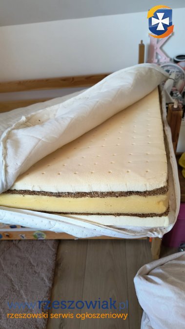 Do łóżka posiadam dwa solidne materace o wysokości 10 cm. Wkład materaca to pianka poliuretanowa, pianka lateksowa obustronna, mata kokosowa obustronna. Materac jest dwustronny. Materace o wymiarach 80x190 cm zakupiony u producenta materacy ALKA