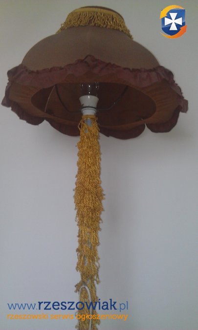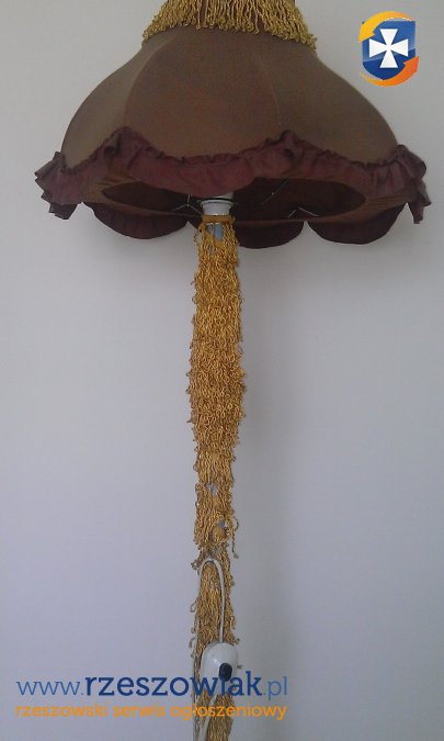 Sprzedam sprawną lampę podłogową stojącą z brązowym materiałowym abażurem za 75 złotych. Wysokość lampy 140 cm, średnica abażuru 50 cm. Jasionka k/Rzeszowa tel. 732 941 638.