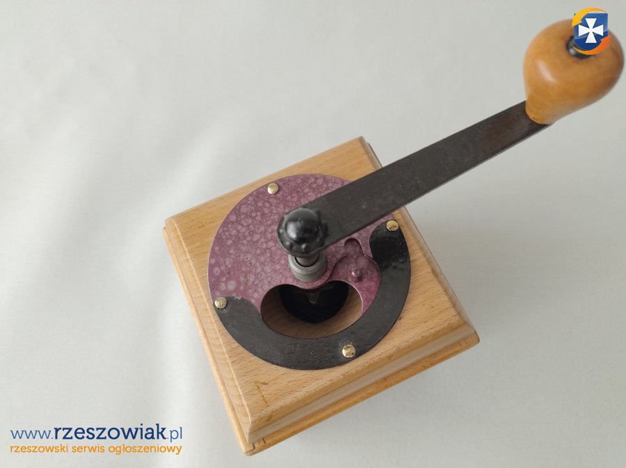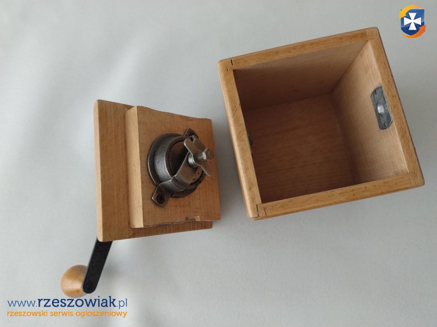 Sprzedam stary drewniany młynek do kawy najprawdopodobniej marki Matebo produkowany w latach 30. lub 40. XX wieku.
