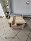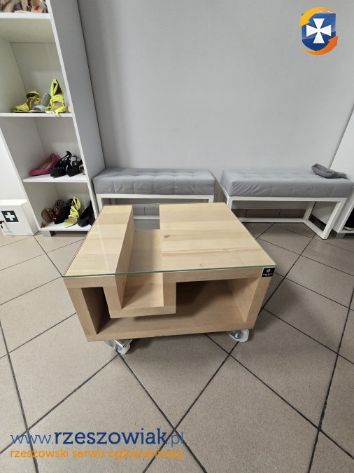 Blat częściowo szklany, dół drewniany z praktycznymi wnękami.