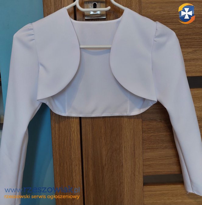 Sprzedam sukienkę komunijną Długość 110 cm Bolerko długi rękaw Regulacja w pasie Koło w spódnicy, można wyciągnąć Dodatki: torebeczka, wianek, rękawiczki