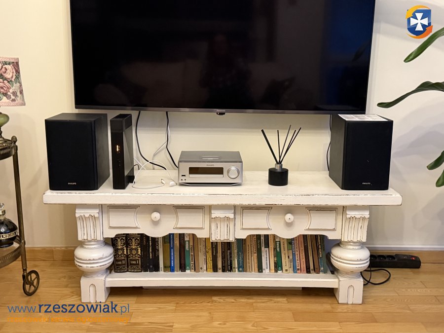 Sprzedam szafkę RTV AGD z drewna dębowego malowaną na biało na staroć poprzez tworzenie efektów przecieranych w stylu shabby chic - jak na zdjęciu Polecam i zapraszam do zakupu.