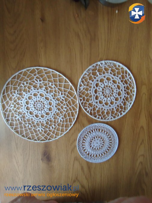 Sprzedam trzy serwetki na obręczach metalowych. Można je udekorować wstążkami wg.własnego uznania. Bez wstążek są również bardzo atrakcyjne i delikatne. Średnica: 25,20,15.