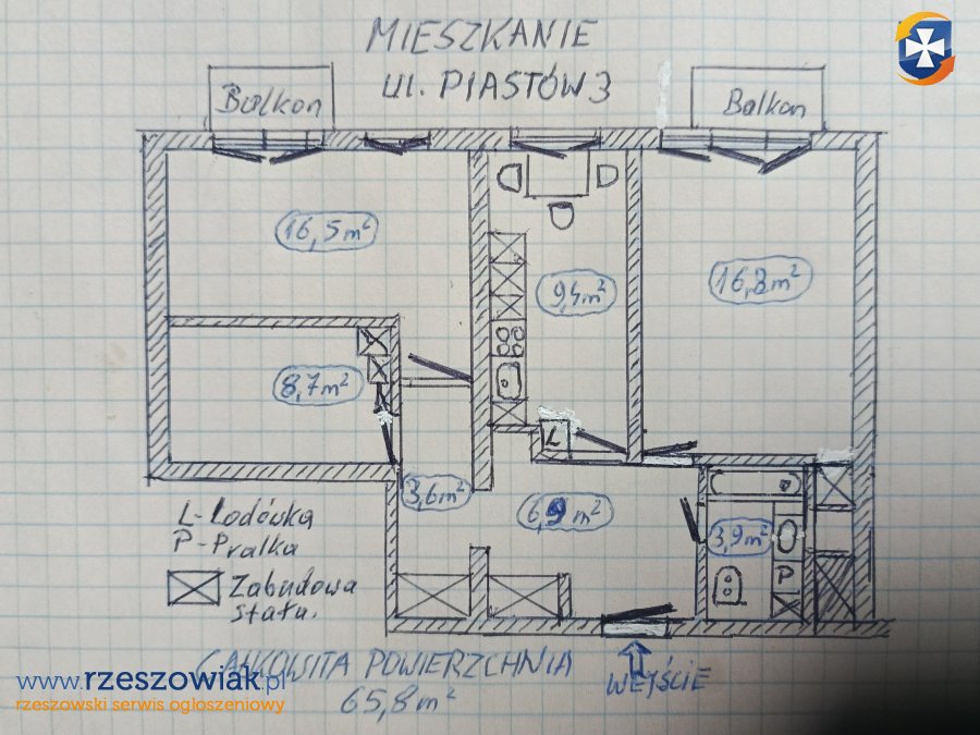 Sprzedam trzypokojowe słoneczne mieszkanie o powierzchni 65 m2, na 9-tym piętrze, na ul Piastów w Rzeszowie. Mieszkanie ma dwa balkony, z których roztacza się ładny widok na miasto. Kuchnia jest po remoncie, a w przedpokoju są dwie wbudowane duże szafy. Wyposażenie AGD: Nowa pralka i kuchnia elektryczna oraz lodówka i kuchenka mikrofalowa. W odległości 5-ciu minut drogi od mieszkania jest: Zielony Ryneczek, Lidl, kilka sklepów oraz szkoła i boisko Orlik, a w odległości 10 min są Rzeszowskie Bulwary, Politechnika i WSK. Do rynku jest 15 min. Parking na ulicy, lub płatny. (przynależny do mieszkania) na wprost bloku.Blok jest po remoncie.