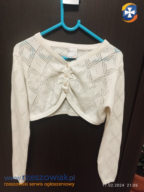 Sprzedam używane bolerko Cocodrillo dla dziewczynki rozmiar 134. Kolor ecru. Stan bardzo dobry. Odbiór osobisty.