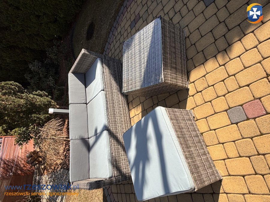 Sprzedam używane meble ogrodowe 3 osobowa sofa pufa i stolik w komplecie poduszki na siedzisko wykonane z imitacji ratanu stan dobry nieliczne ślady użytkowania wymiary sofy 177/67 stolik i pufa 60/60