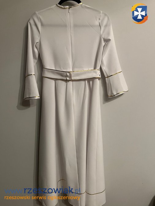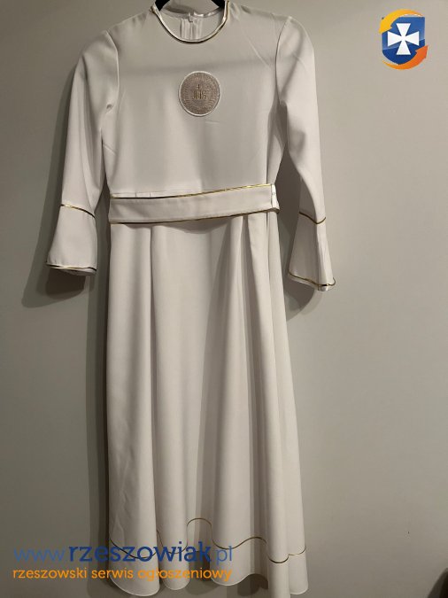 Alba starannie uszyta ze złotymi zdobieniami. Długość od karku 118 cm, szerokość od pachy do pachy 41 cm, szerokość w pasie 41 cm. Długość rękawa od pachy 37 cm. Noszona przez jedno dziecko.