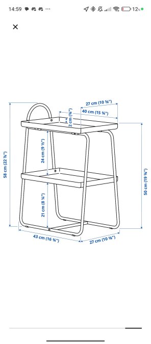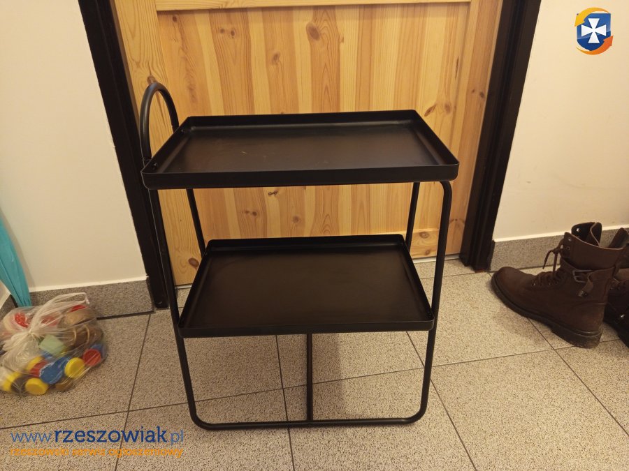 Posiada dwie półki. Zajmuje mało miejsca, wąski i niski ( wymiary podane w ostatnim zdjęciu). Matowy, czarny, metalowy. Nosi ślady uzytkowania w postaci rdzawego mało widocznego śladu na górnej półce, i drobne zarysowania.