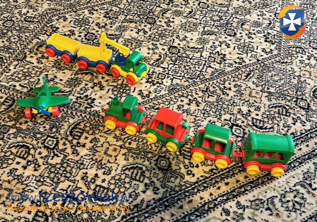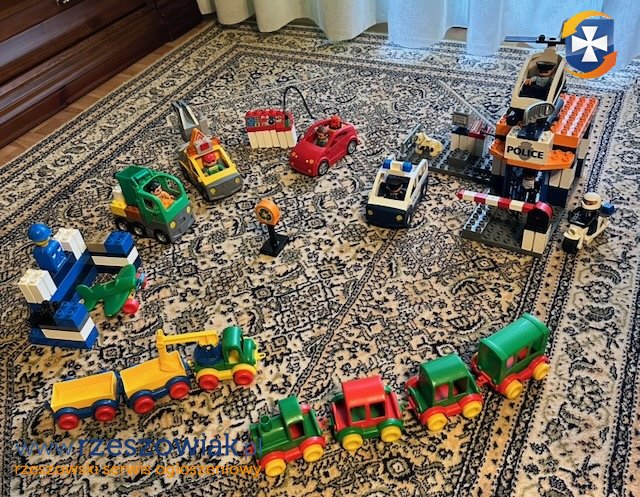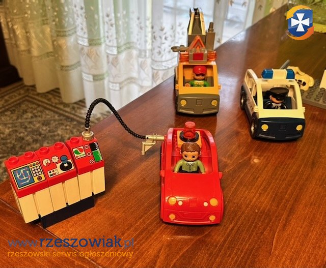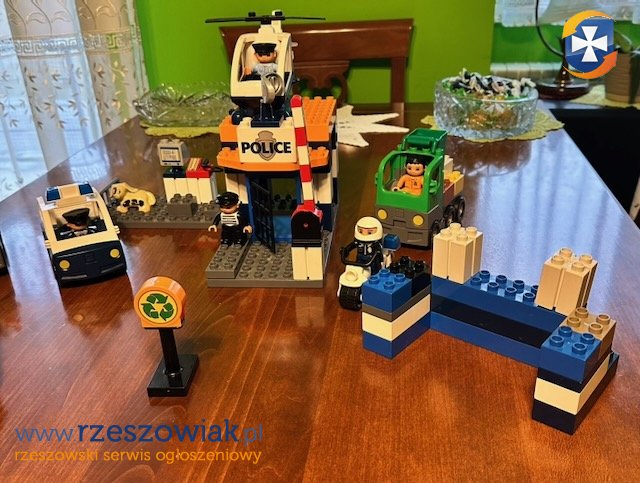 Sprzedam zbiór klocków Lego Duplo w bardzo dobrym stanie. W zbiorze znajdują się kompletny zestaw policji, śmieciarka z koszem i kierowcą, samodzielnie cabriolet ze stacją paliw oraz samochód pomocy drogowej z elementami. Ponadto do zbioru dołączam pociąg marki Wader, samolot jednopłatowy i zestaw pojazdu koparka z dwiema przyczepami.