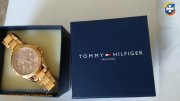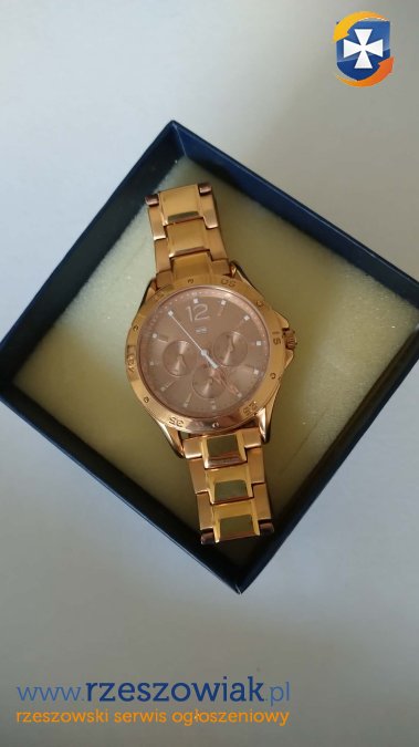 Sprzedam zegarek Tommy Hilfiger, tarcza w kolorze różowego złota, z tarczy nie została odklejona folia zabezpieczająca. Ja mam nadgarstek 16 cm i jeszcze trochę luzu. Bransoleta odpinana. Odbiór osobisty Rzeszów Drabinianka. Zegarek używany.