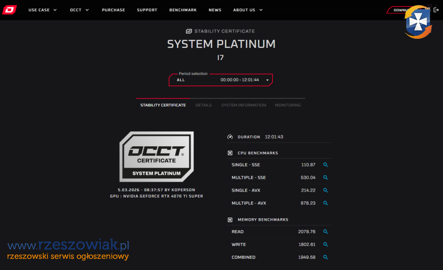 Stabilność potwierdzona Certyfikatem OCCT PLATINUM 12h - link do strony z certyfikatem dla zainteresowanych kupnem.