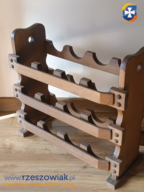 Stojak drewniany dębowy na wino. Na drewnie widnieją niewielkie ślady upływu czasu. Stojak jest stabilny i sztywny w dobrym stanie.