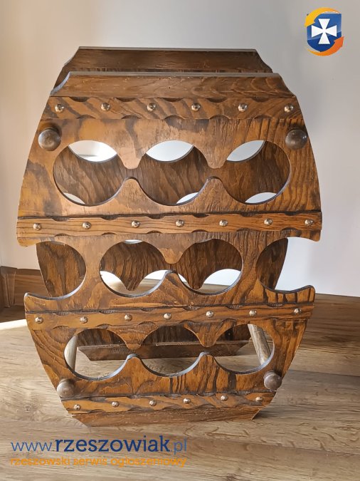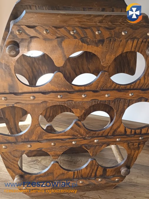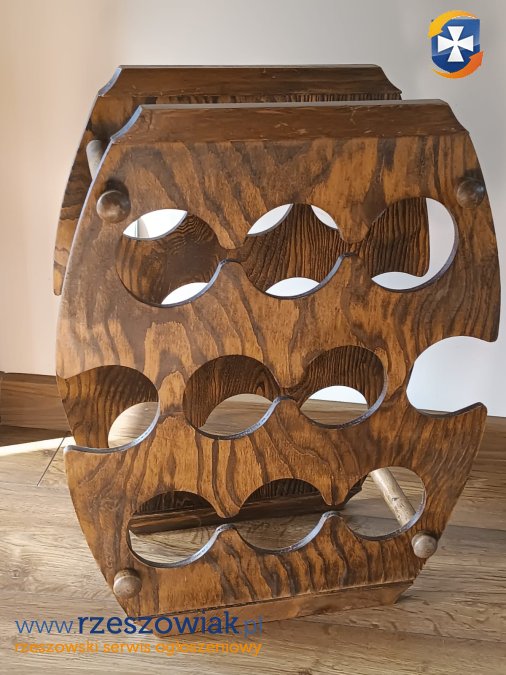 Stojak drewniany na wino. Na drewnie widnieją niewielkie ślady upływu czasu. Stojak jest stabilny i sztywny w dobrym stanie