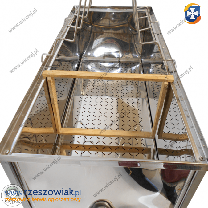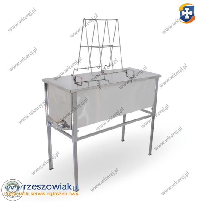 Posiadam w sprzedaży nierdzewny dwustanowiskowy stół 1m do odsklepiania ramek typu Wielkopolska ( w zestawie nierdzewna Pokrywa, nierdzewne Perforowane Sito i nierdzewna nakładka dwustronna na stół). Stół 1m do odsklepiania ramek wyposażony w perforowane sito. Stół oraz sito wykonane ze stali nierdzewnej kwasoodpornej AISI 304. Stół jest przystosowany do wieszania ramek typu Wielkopolskie lub Ostrowskiej.