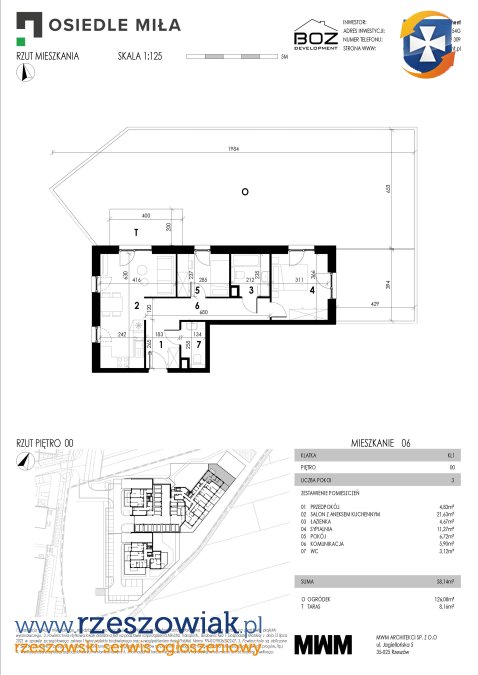 STRAŻACKIEJ 54G NR 6, 3-pokojowe na parterze o powierzchni 58,14 m2, które składa się z: PRZEDPOKOJU SALONU Z ANEKSEM KUCHENNYM ŁAZIENKI SYPIALNI POKOJU KOMUNIKACJI WC OGRÓDKA - 126,08 m2 TARASU - 8,16 m2