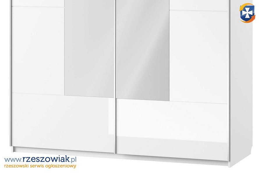 Szafa ubraniowa z dwoma drzwiami przesuwnymi, z lustrami z kolekcji mebli systemowych " SELENE" to połączenie funkcjonalności z oryginalnym designem i lekkością jaką nadają fronty w białym wysokim połysku.