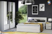 - białą sypialnię z łóżkiem, szafkami nocnymi, toaletką i komodami