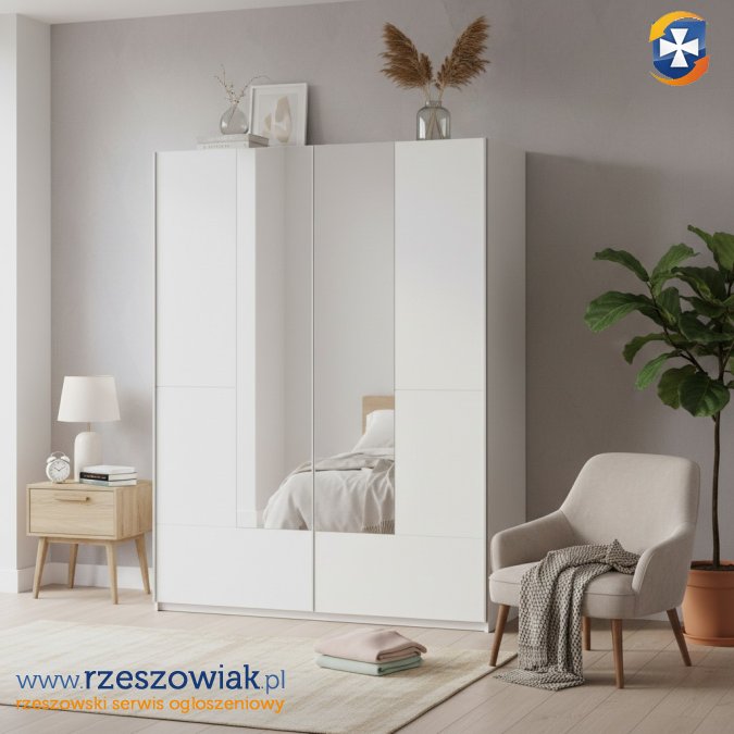 Szafa ubraniowa posiada dwoje drzwi przesuwnych z lustrami. Za drzwiami po lewej stronie znajduje się bieliźniarka z półkami, po prawej stronie półka oraz drążek do wieszania ubrań.