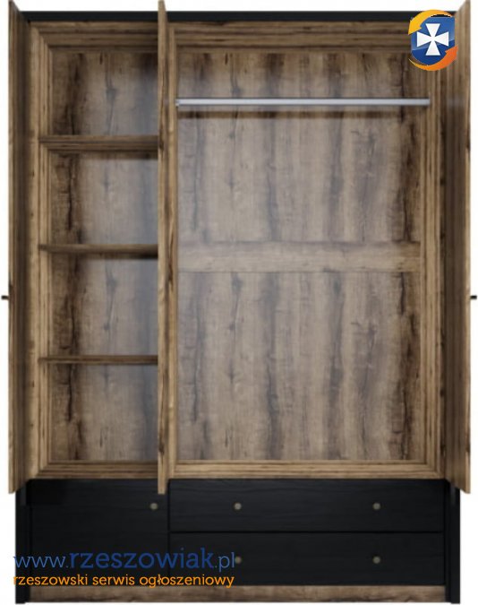 Szafa z serii JAGGER wyposażona została w pięć półek po lewej stronie oraz drążek na wieszaki i dwie półki po prawej stronie. Kolekcję można uzupełnić pozostałymi meblami z kolekcji Jagger. System pasuje do wielu stylów wnętrzarskich.