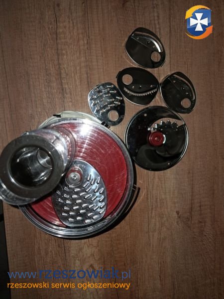 akcesoria w zestawie: tarcza do szatkowania na drobno, tarcza do krojenia na grubo, tarcza do krojenia na drobno, tarcza do szatkowania na grubo, tarcza do krojenia w słupki, tarcza do frytek