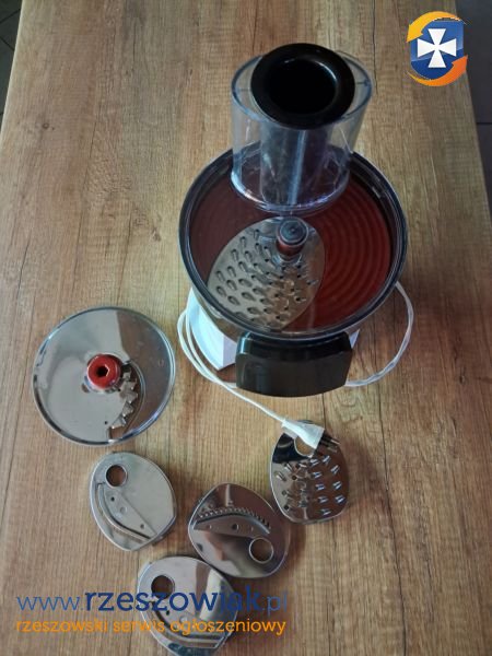 akcesoria w zestawie: tarcza do szatkowania na drobno, tarcza do krojenia na grubo, tarcza do krojenia na drobno, tarcza do szatkowania na grubo, tarcza do krojenia w słupki, tarcza do frytek