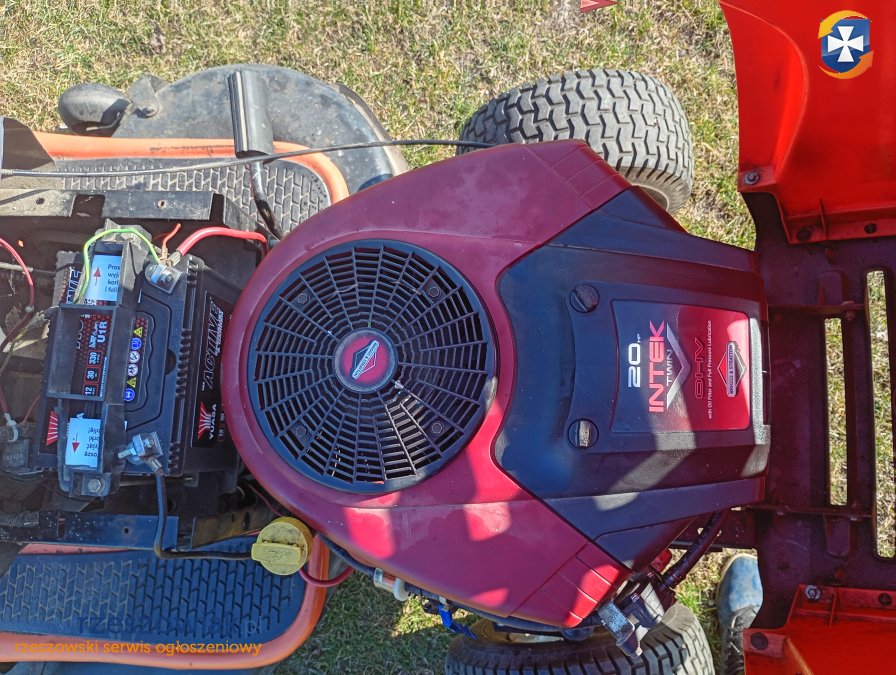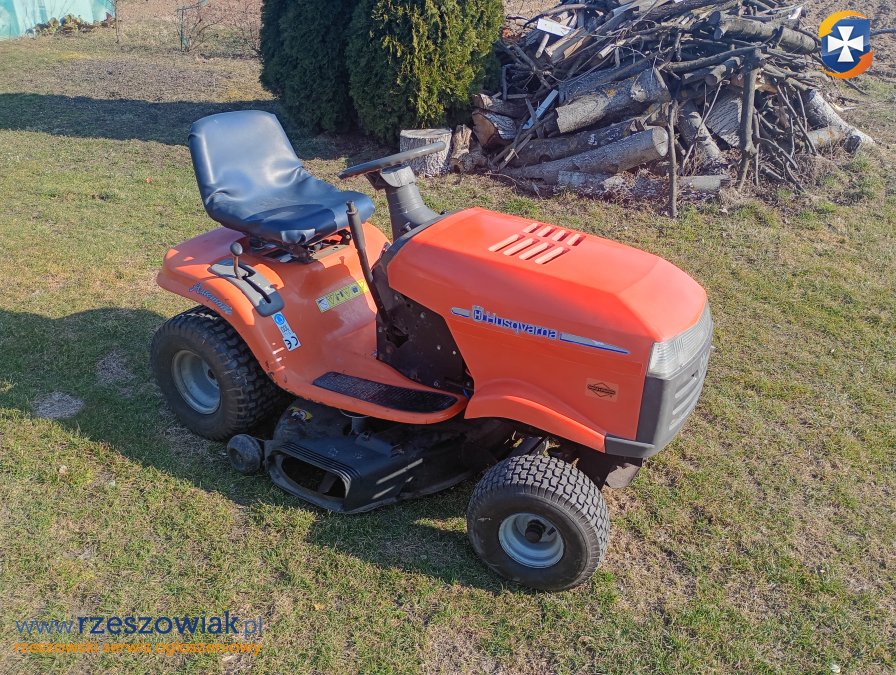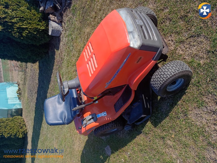 Traktor koszący Husqvarna z silnikiem 20 KM i dwoma cylindrami. Używany, ale w bardzo dobrym stanie technicznym. Idealny do pielęgnacji trawników i ogrodów