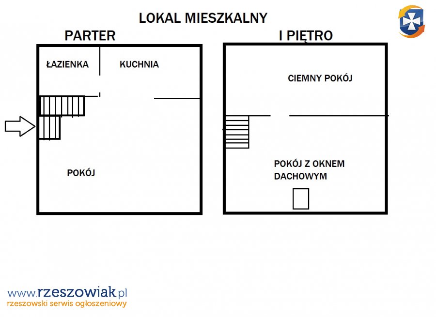 PIĘTRO: 2 małe pokoiki ( w tym jeden bez okna, w drugim pokoiku okno dachowe). Wysokość pomieszczeń 2.27m.