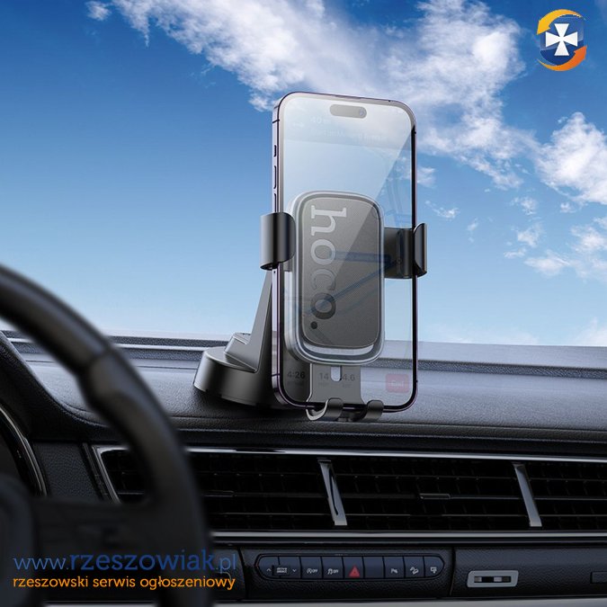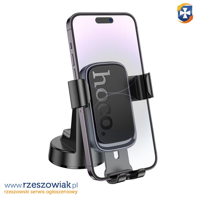 Uchwyt samochodowy z przyssawką do deski rozdzielczej. Wbudowany system regulacji umożliwia dopasowanie uchwytu do preferencji użytkownika.