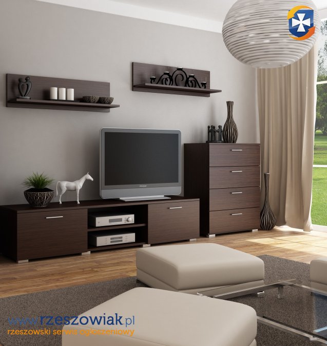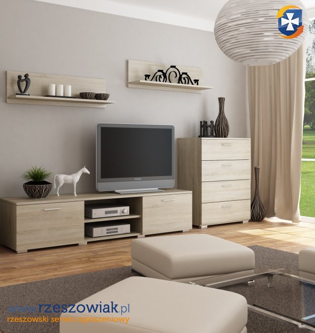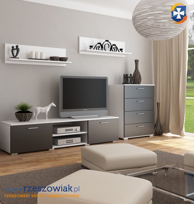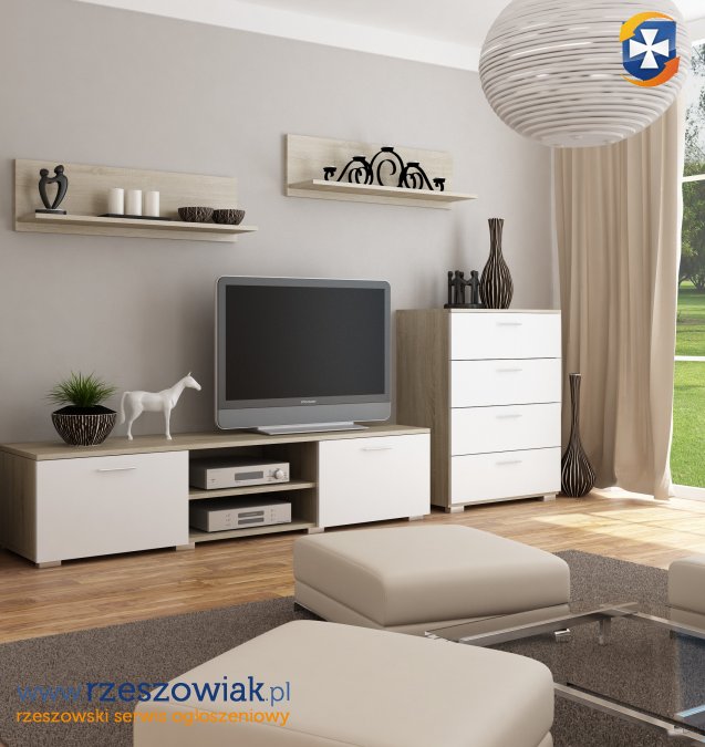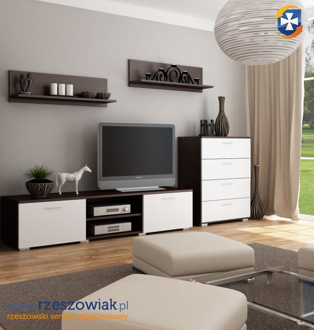 W skład meblościanki wchodzi: szafka rtv, komoda oraz 2 półki wiszące.