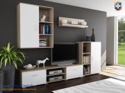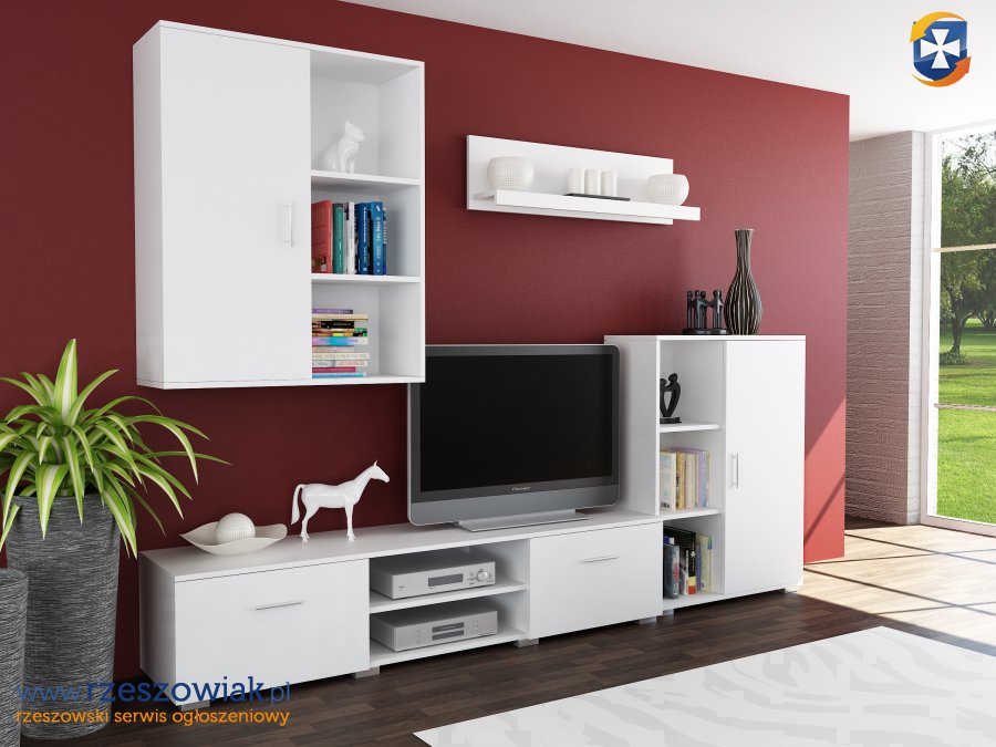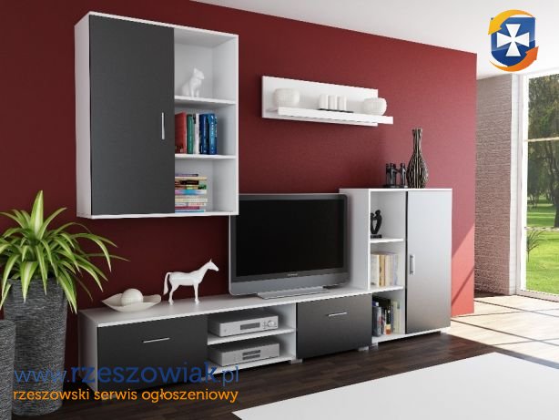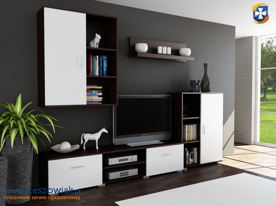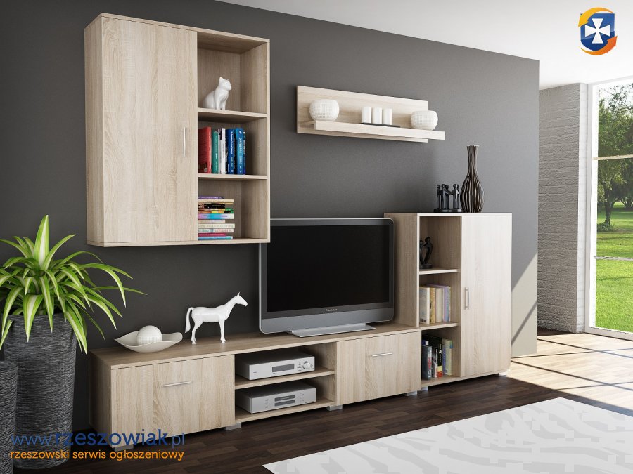 W skład meblościanki wchodzi: szafka wisząca, szafka rtv, szafka stojąca, półka wisząca.
