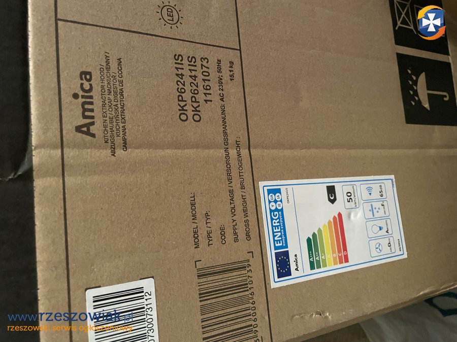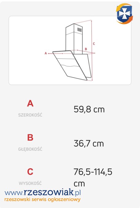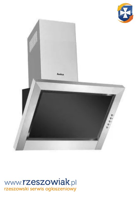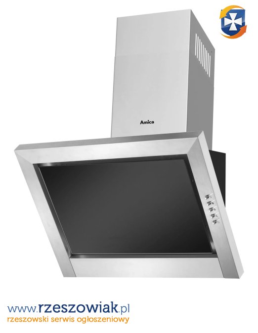 Nowy okap kominowy Amica, wertykalny o klasie energetycznej C. Szerokość 60 cm, głośność 65dB, wydajność 363 m3/h. Kolor: Srebrny.