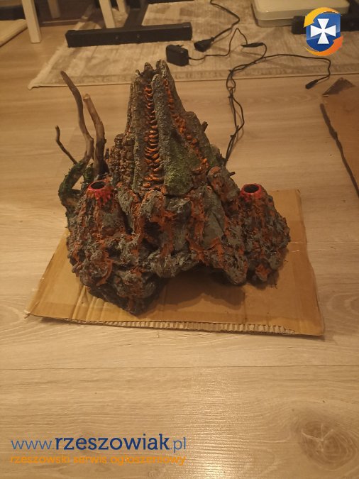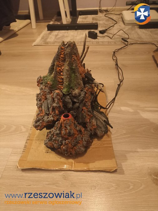 Witam mam do sprzedania gotową aranżację do akwarium o wymiarach dł 35cm, szer 27,wysokość 30cm, waga ok 8kg Aranżacja składa się z trzech wulkanów, w którym są zainstalowane oryginalne ledy,które zmieniają kolory cyklicznie duży oprócz ledów, potrafi też wytwarzać mgłę przy odpowiednim poziomie wody, ponadto wszystkie wulkany można podłączyć do napowietrzacza. Wulkany są oryginalne .Całość jest wykonana z kamienia łupkowego czarnego sklejonego żywicą poliestrową co gwarantuję trwałość kolorów w wodzie. Sprzedaję bo zmieniła mi się koncepcja co do aranżacji. Aranżację zrobiłem na swoje potrzeby.Zainteresowanych proszę o kontakt, cena jest do negocjacji, na pytania odpowiem Jeżeli się komuś