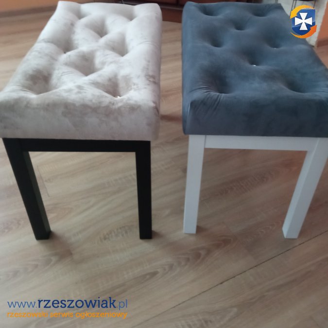 Siedzisko ławki oparte jest na stelażu bukowym.Jedna ławka jest w kolorze beżowym pikowana złotymi kryształkami a druga jest w kolorze szarym pikowana kryształkami